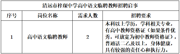 清遠市梓琛中學創(chuàng)辦于1987年,學校原名廣智中學,2002年為紀念香港同胞梁梓琛先生易名為梓琛中學,2013年學校從鎮(zhèn)屬高中升格為清遠市教育局直屬高中。學校是清遠市華僑中學協(xié)同發(fā)展學校、清遠市禁毒教育示范校、清遠市積極教育示范校、清遠市學校文化建設(shè)示范校、清遠市生命健康安全學校、廣東省綠色學校、廣東省依法治校達標校。學校以廣智教育立校辦學,努力打造自勝致遠精神,培育學生“廣天下之智”。為適應(yīng)學校教育教學的實際需要,現(xiàn)需招聘高中語文臨聘教師兩名。